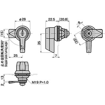 パネル穴明け寸法は各種コインロックと互換性があります。(Φ19.5×16)止め金が本体に付いた状態で取付けが行えます。(板厚2.5mmまで)コンパクトタイプの軽量ハンドルです。本体後部の止め金と回転カムの組込方向により左右組替が可能です。