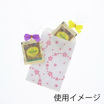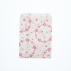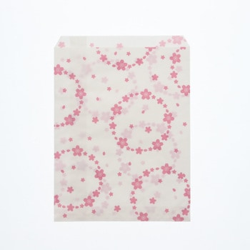 桜柄トータル「舞桜」の柄小袋。心もほころぶ桜の柄で贈り物を優美に演出します。上部の折り返し部分は、袋の貼り合わせのある側についています。ベロ部分を手前側に折って、使用することが一般的です。※ベロ部分は高さに含まれません。