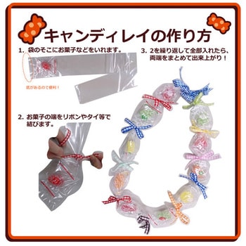 保育園やイベントのバザー等でよく見かける、飴や小さいお菓子が入った首飾り(レイ)を作るための透明袋です。