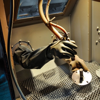 うちのブラスト機器は手を挿入する箇所が穴が開いており、手袋を装着してその穴に挿入するタイプでどうしても多少砂が漏れることを危惧していました。