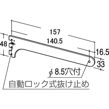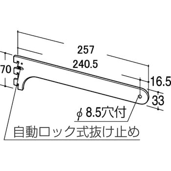スリット穴掛け式棚等設置システムの、ハンガー横掛け陳列用丸パイプ設置用腕金具(相手パイプにRN加工が必要)