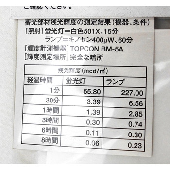 太陽光や蛍光灯の光を約10~30分照射した場合、受けた光を蓄積し、6~8時間暗闇の中で光り続けます。