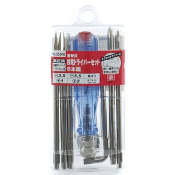 高圧用検電ドライバーセットです。検電の際、ドライバーの柄部末端にあるネジを親指で押さえ刃先をプラス側に接触させれば、柄の内部のネオン管が発光し、電気の導通の有無・異常がわかります。オフセットドライバー付きです。ドライバーとしてもご使用いただけます。