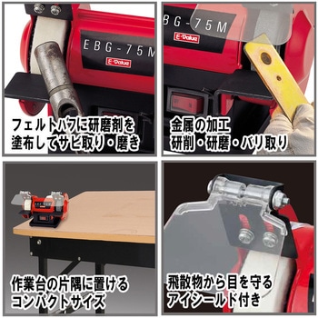 砥石によるバリ取り・研削作業、バフによる研磨・ツヤ出し作業が机の上でできます。屋内でも作業できる低振動・低騒音設計です。