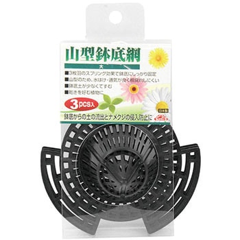 鉢植えの必需品です。鉢底からの土の流出防止、ナメクジの侵入防止に最適です。3枚羽のスプリング効果で鉢底にしっかり固定できます。山型の為、水はけ・通気が良く根腐れしにくです。鉢底土が少なくてすみ、乾きを好む植物に最適です。