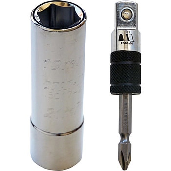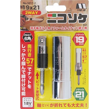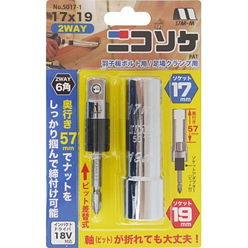 【使用頻度の多い2サイズのソケットを1本のソケットに!】使用頻度の多い2サイズのソケットを1本のソケットにしました。奥行きが57mmあるので、ボルト・ナットをしっかり掴んで締付け・緩め作業が行えます。ソケットアダプターの軸部は両頭ビットになっているので、軸が折れた場合もビットの交換のみで対応できます。17×19は羽子板ボルト・足場クランプ用、19×21は羽子板ボルト・フォームタイナット廻し用に便利です。