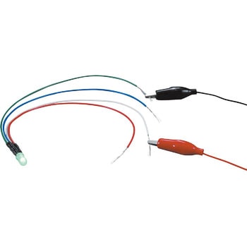 高輝度タイプのLEDランプに赤緑青白のリード線が付いており、+極に白線、-極に各線を接続するとそれぞれの色に光ります。 赤緑青の全てを接続すると白色に光ります。