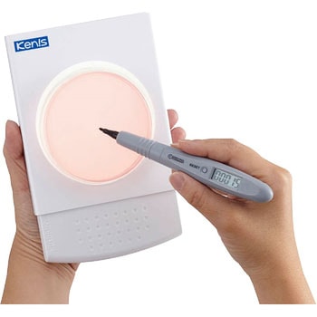 小型・軽量・薄型で、女性でも手に持って使用できるライト台です。楽な姿勢で使用できるので、長時間の作業においても体への負担を軽減できます。 手に持って傾けて使用してもシャーレが落下しません。 ディッシュのコロニー計数に必要な範囲のみの照光になりますので、目の負担を軽減できます。 LED光源なので、スイッチをつけて、すぐに使用できます。 スタンダードにはカウンターペンが付属しています。ペン先でディッシュにマーキングすると同時に音が鳴り、デジタルカウンターにマーキング数が加算されるので、コロニー数の計測に最適です。