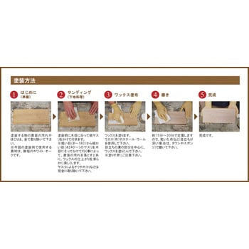 木目を石灰のように白く、優しく仕上げる滑らかなペースト状のワックスです。特にオーク等の「環孔材」(木目がはっきりある木材)に向いています。掃き出しの木や、着色された表面に直接塗装することが可能です。パイン材などは目立てをすると(ワイヤー・ブラシで木目を浮き立たせる)ことにより、高い効果を得ることができます。また、耐久性を高める為にクリア色のブライワックスを上から塗ると効果的です。