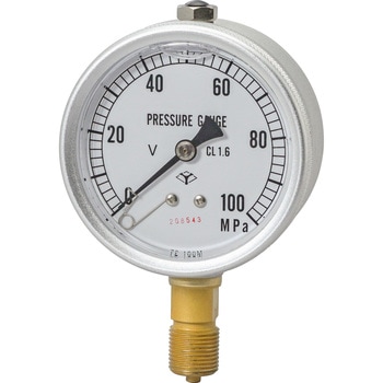 グリセリン封入形で振動や脈動に対して狂いが少なく、指度の読取が容易です。圧力計は油圧(MPa)表示としています。形式表示は圧力計の外径とフルスケールで表しています。圧力計にkN目盛を施す場合は、シリンダ内径または受圧面積を明記し、そのジャッキにのみ使用できます。向きは銅パッキンの枚数で調整してください。