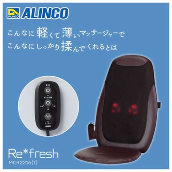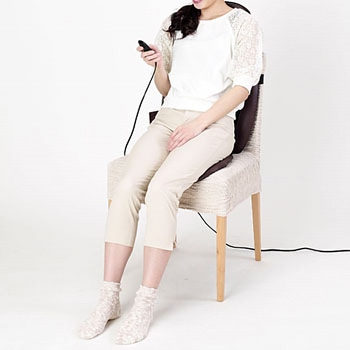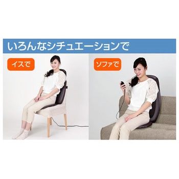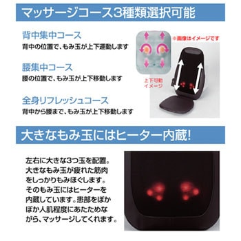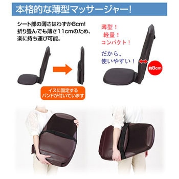 シート部の薄さはわずか8cm、折り畳んでも薄さ11cmのためラクに持ち運びが可能。椅子やソファ、壁などに設置するとマッサージャーに早変わり。マッサージコース3種類:背中集中コース/腰集中コース/全身リフレッシュコース。大きなもみ玉にはヒーター内蔵!人肌程度に温めながらコリをほぐす。左右にそれぞれ大きな3つ玉を配置。ローリングしながら上下に動き、腰から背中にかけてしっかりもみほぐします。椅子に固定するバンド付。便利なリモコン搭載(コントローラー収納ポケット付き)。