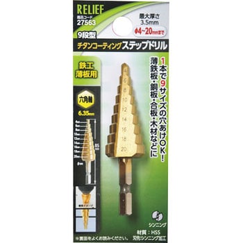 バリ取り、穴のくり広げ、面取りなど1本で9サイズの穴あけができます。チタンコーティング仕様で耐摩耗性、耐熱性に優れています。シンニング加工を施しており喰い付きがよくポンチが不要です。充電式インパクトドライバー、充電式ドリルドライバー、電気ドリル、ボール盤などに使用できます。