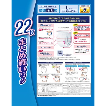 「スルッとはける」介助があれば立てる方・座れる方のための、軽い力で上げ下げできる、排泄リハビリに最適な紙パンツ●軽い力でサッと広がりはきやすい。●特許技術「股下すっきり設計」※1で身体とのすきまをつくらずぴったり安心。●特許技術 ご本人でも破りやすい「らくらくステッチ」※2。両脇を破って、サッと脱げる。●特許技術 背中・足ぐりにふんわりフィットする「背中・足ぐりピタッとギャザー」がすきまモレを低減。●背モレブロック構造。尿・軟便をせきとめる空間が背モレを防ぐ。●特許技術 ギャザー間が広い「パッドすっぽりギャザー」でパッド交換が簡単。●特許技術 おしりに引っかからない「スルッとゾーン」がウエストゴムの巻き込みを防止。●特許技術 「足入れスムーズ」によりすっきり形状で足の指がひっかからない。●「やわらかストレッチゾーン」が軽い力で2倍に広がる。●「しっかりフィットゾーン」がズレを防ぐ。●「スーパーロング吸収体」でおなかからお尻まですっぽり包む。●全面通気シートで、ムレずにサラサラ。●下着のような肌触り。●パワー消臭トリプル効果※3。<以下注釈>※1股下の吸収体括れ部の前後とその前側にある変形誘導部により、股下部とその前側を股間の凹部から脚繰りに沿って肌側に凸に変形しやすくする吸収体構造。※2係止部の剥離強度が製品横方向に比べて縦方向が弱い、サイドシール構造。※3アンモニア・ジメチルアミン・インドールについての消臭効果があります。おしっこ約5回分(約750cc)を吸収します。医療費控除対象品