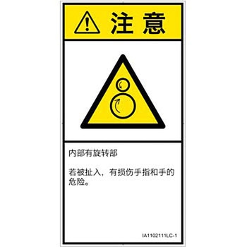 | 57184173 | IA1102112LC-1 | 1シート(6枚) | 回転部あり 引き込まれると、指や手を損傷する恐れあり。 ラベル準拠規格: ISO 7010:2011 対象業界: 一般機械、半導体 対象者: 保守要員 | 122×62 | | | |