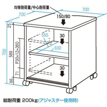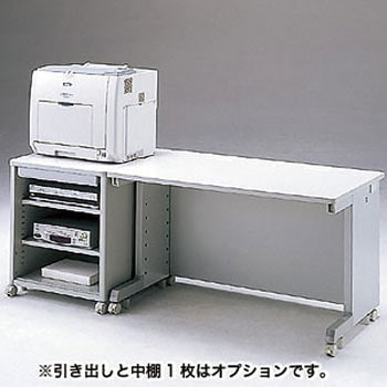 総耐荷重200kgで大型プリンタの設置が可能です。eデスクと同じ天板を使用し、デスクの横に置いても違和感がありません。また、バックパネルも付属し、オフィスの美観を損ねません。サイズバリエーションが豊富で、プリンタサイズ、設置場所に応じたサイズが選べます。オプションで、引き出し、前扉の取り付けが可能です。また複数の用紙を保管する場合は、中棚の追加も可能です。天板にはケーブル口が付属し、下棚にもケーブル配線口付です。ケーブル配線が容易なため、中棚の追加で、AV機器ラックとしても使用できます。アジャスター併用時。