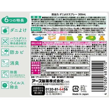 ダニよけ成分(植物エキス、カルボン酸エステル)、除菌成分(孟宗竹抽出物)、消臭成分(緑茶エキス)、ハウスダスト除去成分、エタノール、香料
