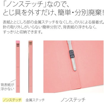 「ノンステッチ」なので、とじ具を外すだけ、簡単・分別廃棄!表紙とじしろ部の金属ステッチをなくした、のりによる接着式です。針の取り外しがいらない簡単分別で、背表紙の浮きもなく、すっきりと収納できます。