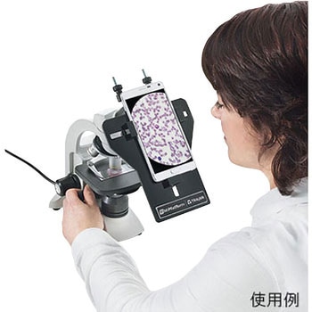 スマートフォンを顕微鏡の接眼レンズに設置することができます。接続したスマートフォンで写真撮影や画像確認が行えます。