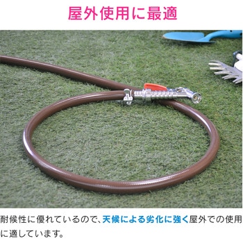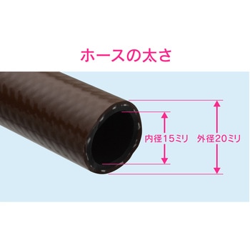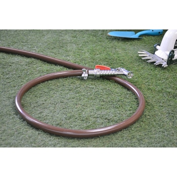 散水用ホースです。耐候性に優れ、屋外の使用に適しています。2層構造と補強材の使用により折れにくく、しなやかなホースです。内側は黒色で藻が発生しにくくなっており、外側はブラウンで草木によくなじみます。