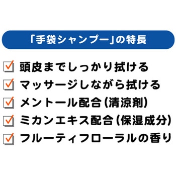 水を使わず、拭くだけカンタン、手袋型なので細かい所もしっかり拭き取れます。頭皮の汚れもスッキリ爽快です。ノンアルコール。