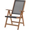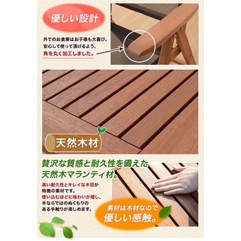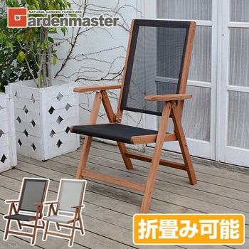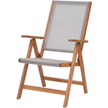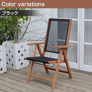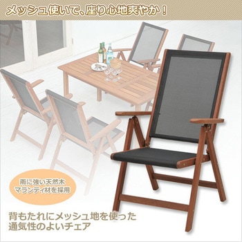 通気性の良いメッシュ仕様の背もたれと座面のチェアで心地よく座れる。リクライニング機能付(7段階)で、好みの角度でくつろげる。折りたたみ可能。雨に強い天然木マランティ材を採用。