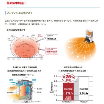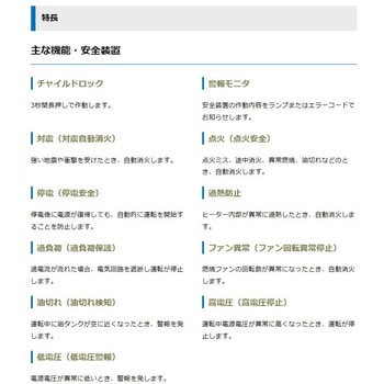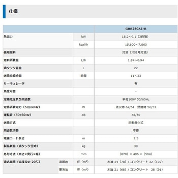 油タンク容量(L)22仕様燃焼切替:3段階、周波数切替:不要種類放射式直火形定格電圧(V)単相100(50/60Hz)寸法(高さH×幅W×奥行D)(mm)870×504×496安全装置耐震(耐震自動消火)、点火(点火安全、停電(停電安全)、過熱防止、過負荷(過負荷保護)、油切れ(油切れ検知)、高電圧(高電圧停止)、低電圧(低電圧警報)、ファン異常(ファン回転異常停止)、チャイルドロック、警報モニタ使用燃料灯油 (JIS1号灯油)燃焼方式回転霧化式電源コード(m)2.5燃料消費量(L/h)1.87~0.94適合面積(m2)【温暖地】木造78(24坪)/コンクリート107(32坪)、【寒冷地】木造68(21坪)、コンクリート91(28坪)運転音(dB)48/50(50/60Hz)点火時消費電力(W)(50/60Hz)67/64燃焼持続時間(h)11~23燃焼時消費電力(W)(50/60Hz)56/53熱出力(kW[kcal/h])18.2~9.1[15600~7860]内容量1台