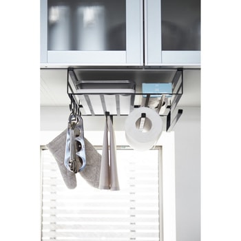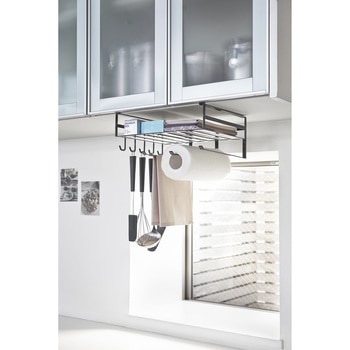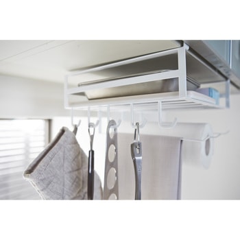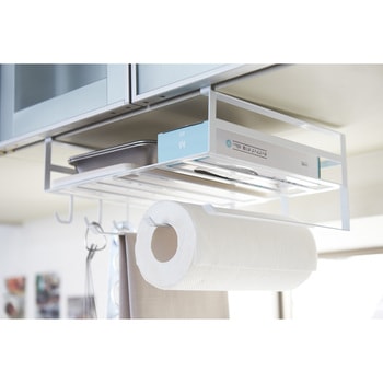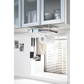 吊り戸棚の下を有効活用!キッチン小物をたっぷり収納。よく使うキッチンペーパー、布巾、調理道具、ラップ類など一括収納。お弁当箱・タッパー・キャニスター・スパイス・パスタなどのストックに!頻繁に使うフライパン(直径28cmまで)も入ります。まな板・布巾・ラップ類・フライパン・鍋ふた・レシピ本など収納可能。キッチンツールを掛けておくのに便利なフックが5個。ラック下の隙間を利用してポリ袋やティッシュ箱からそのまま取り出せます。布巾やタオルを掛けられるハンガーが3本。