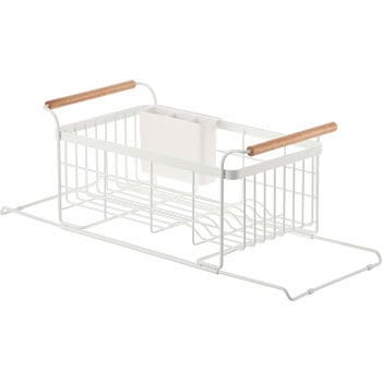 シンクのサイズに合わせて伸縮できる水切りラック。持ち手に布巾を干すことができます。カトラリーなどを干すのに便利なポケット付き。お皿を立てて干すことができます。まな板も立てて干すことが出来て便利。シンクの奥行きに合わせて39~60cmまで伸縮可能。省スペースで洗い物をすっきり干せます。