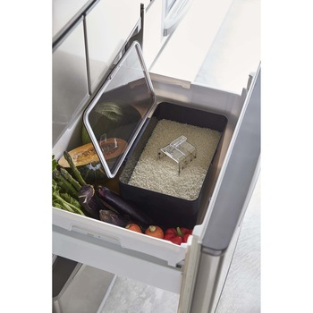 システムキッチンの引き出しに合うスタイリッシュな米びつ。パッキンでしっかり密閉され、お米が最後まできれいにすくえます。蓋をパチッとロックしておけば、お米を湿気と酸化から防いでくれます。炊飯器の横に置いておけば作業もスムーズ。蓋は全面が開くからお米がすくいやすく、残量が分かりやすい透明蓋。底の形が付属の計量カップにピッタリとフィットするから、残りのお米をきれいにすくい取ってくれます。