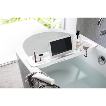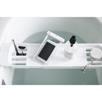 伸縮式で浴槽の縁にぴったりフィットのバスタブトレー。防水のTVやラジオやスマートフォンなどを持ち込めば、お風呂で音楽・映画鑑賞ができ、ゆったりくつろぎの時間を過ごせます。浴槽の幅に合わせて内も伸縮!裏面は滑り止め付きでしっかり安定。ケアグッズなどを立てられるポケット付き。