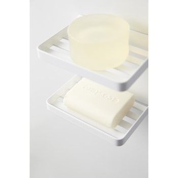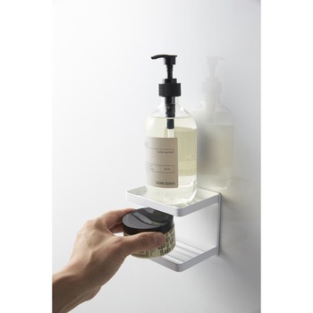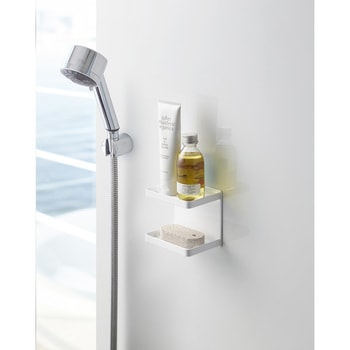 マグネットが付く浴室壁面に簡単取り付けのソープトレー。1つ分のスペースで2個置ける省スペースタイプ。ディスペンサー・タンブラー・洗顔チューブも置けます。