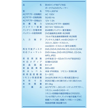 用途キッチンやお風呂等の水回りでポータブルテレビ、プレーヤとして。仕様【再生可能ディスク】DVD、DVD-R、DVD-RW、CD、CD-R、CD-RWセット内容ACアダプター、リモコン、リモコン初期動作確認用電池(CR2。025)、miniB-CASカード、ワンセグ用アンテナ、アンテナ端子変換プラグ、吸盤フック(2個)、吸盤フック用シート(2枚)、カー電源用コード(シガーソケット)(12Vマイナスアース車専用、プラグ内蔵管ヒューズF3A/250V)、取扱説明書質量(kg)1.4色ホワイト電源(V)AC100(50/60Hz)消費電力(W)12連続使用時間(時間)【DVD再生】約2、【フルセグ放送視聴】約2バッテリーリチウムイオン本体寸法(幅W×奥行D×高さH)(mm)250×185×52バッテリー電圧(V)7.4保証期間お買い上げ日より1年対応フォーマットDVD-Video、DVD-VR(CPRM)、CD-DA、MP3、JPEGバッテリー容量(mAh)1500画面サイズ9インチ内容量1台