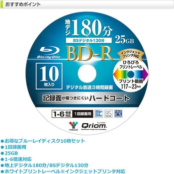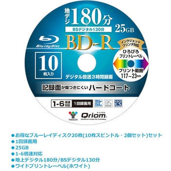 お得なブルーレイディスク10枚スピンドルセット。フルハイビジョン録画対応、鮮やかな感動を美しく録って安心保存。1回録画用。記憶容量:25GB(片面1層)。6倍速記録対応。3時間のフルハイビジョン映像をしっかり録画。優れた互換性で全てのブルーレイ機器メーカーに対応。キズや汚れに強い、安心・長持ち保護コート。手描きもしやすく、プリントも鮮やかに仕上がり。ワイドプリントレーベル(ホワイト) 、インクジェットプリンタ対応。