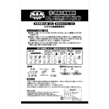 花、野菜、果樹等の肥料として購入しました。価格もお手頃で臭いも気にならず使いやすいペレット状です。効果の程はすぐには現れませんが収穫時期が楽しみです。