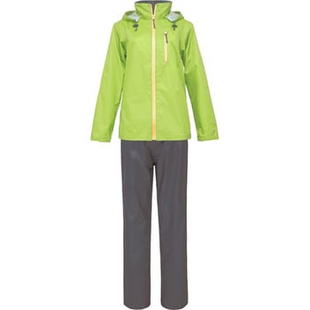 女性用レインスーツ。上着をAライン、ズボンをストレートに。キレイなシルエットに着こなし可能。フロントポケットの止水ファスナーで防水性UP。耐水圧10.000mmH2O以上。表面はっ水機能。襟部にフード収納機能付。収納ポーチ付。
