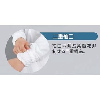 クリーンルーム用ウェア。サイドファスナーで前面からの発塵を抑制します。袖口は二重構造になっています。