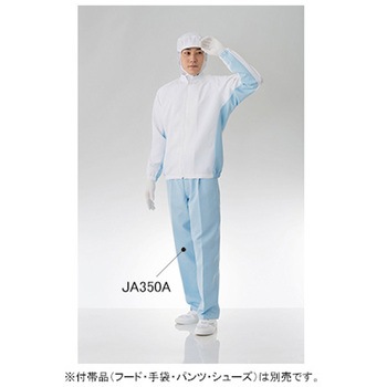 クリーンルーム用ウエア。低発塵で吸汗・速乾性に優れた素材を採用。体側にブルーの配色。男性用。