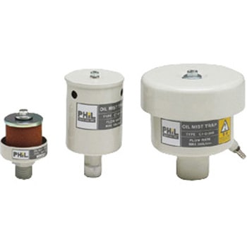 オイルミストとは、油回転真空ポンプの運転中に、ポンプ内部のオイルが煙状となって排気と共に排出されるものです。特に吸入→圧縮→排気の負荷が大きい、大気圧~133.3Paの圧力範囲で発生します。オイルミストトラップは、エレメントによりこれを捕捉し外部へ漏れ出るのを防ぎますので、オイルミストによるポンプ周辺の環境汚染を防止します。さらに、排気音を減少させる効果にも優れています。