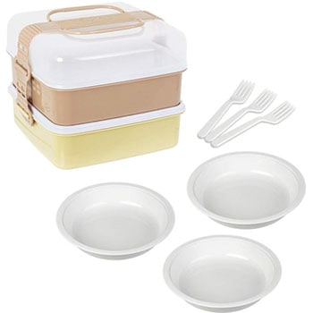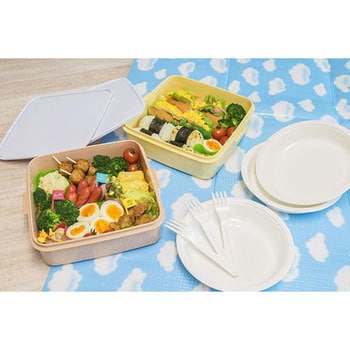 本体・外フタ・取り皿=ポリプロピレン、中フタ・ベルト=ポリエチレン、フォーク=ポリスチレン