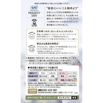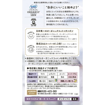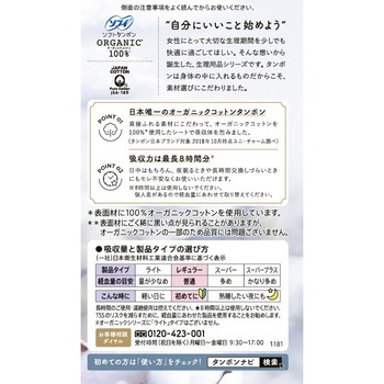 オーガニックコットンタンポンソフィソフトタンポンオーガニック100%女性にとって大切な生理期間を少しでも快適に過ごしてほしい。そんな想いから誕生した、生理用品シリーズです。タンポンは身体の中に入れるものだからこそ、素材選びにこだわりました。●オーガニックコットンを100%使用したシートで吸収体を包んだ、唯一※1の日本製オーガニックコットンタンポン。●指先サイズの吸収体で、最長8時間分※2の吸収力を実現。●身体の中の無感覚ゾーンで吸収するので、使用中の違和感から解放。さらにムレも気にならない。<以下注釈>※1 日本で販売のタンポン日本ブランド対象2024年1月時点ユニ・チャーム調べ。※2 8時間以上は使用しないでください。個人差があるので、経血量に合わせて取り替えてください。※3 表面材にごく稀に、黒い点が見られることがありますが、オーガニックコットンの一部のため、品質に問題はございません。
