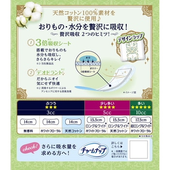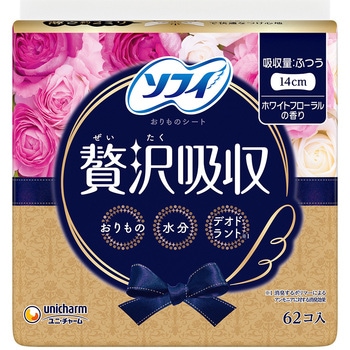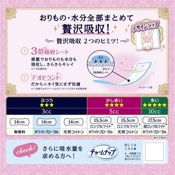 おりもの・水分を贅沢に吸収!●3倍※1吸収シート搭載でおりものも水分も吸収し、さらさらキレイ。●デオドラント※2だからニオイを気にせず快適。●薄さ約2ミリで快適なつけ心地。<以下注釈>※1 メーカー製品比。※2 消臭するポリマーによるアンモニアに対する消臭効果。