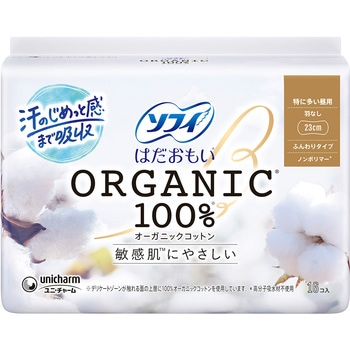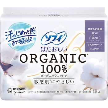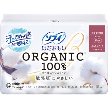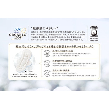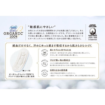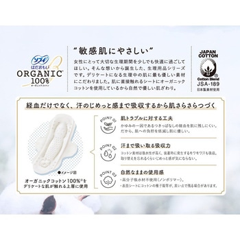 生理中の敏感肌にやさしい、はだおもいORGANICオーガニックコットン100%女性にとって大切な生理期間を少しでも快適に過ごしてほしい。そんな想いから誕生した、生理用品シリーズです。デリケートになる生理中の肌に最もやさしい素材にこだわりました。肌に直接触れるシートにオーガニックコットンを使用しているから自然でやさしい肌ざわり。●デリケートゾーンの肌が触れる面の上層に100%オーガニックコットンを使用。●かゆみの一因であるつきっぱなしの経血を肌に残しにくい。だから、肌への負担を低減し肌にやさしい。●コットン素材は吸水性が高く、装着時に発生するモワモワ汗も吸収。汗がこもらず、肌にやさしい。●高分子吸収材不使用(ノンポリマー)。<以下注釈>※表面シートにコットンの種子殻等が、黒い点で残る場合があります。医薬部外品