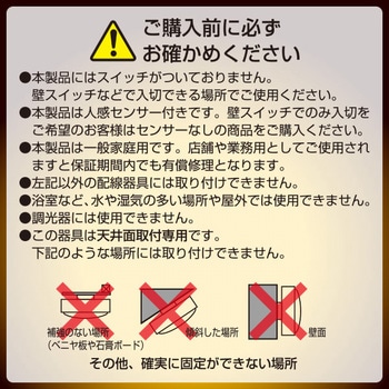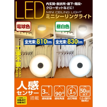 工事不要で簡単取付け。内玄関、脱衣所、廊下、階段、クローゼットなどに適した小型サイズ。人感センサー付き。