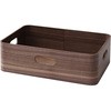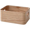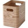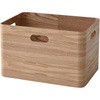 突板仕上げの収納ボックス。角が丸い安心デザイン。持ち手もついて持ち運びもカンタン。積み重ねも可能。ナチュラルにはタモ材突板を、ブラウンにはウォルナット材突板を使用。