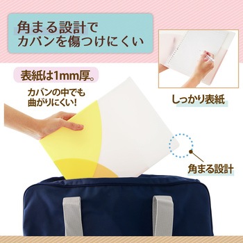カバンの中で曲がったり、底に入り込んでしまったりするストレスがない、分厚く丈夫な表紙。