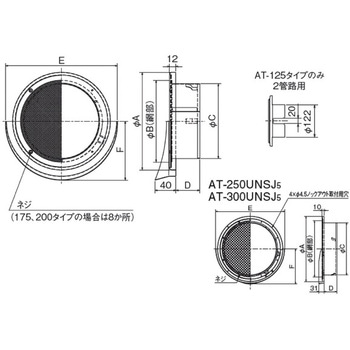 網部脱着可 125タイプは2管路仕様(VM管取付可) 色調:シルバーメタリック 粉体焼付塗装 材質:SUS304