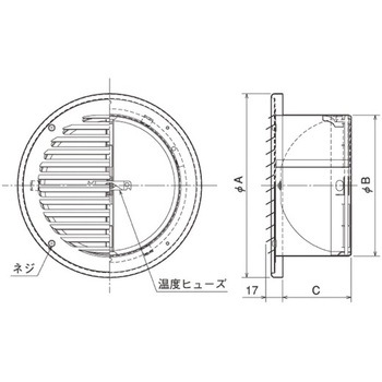 防火設備該当品(第01EG021号) ギャラリ部脱着可 コンパクトフェイス(ベントキャップより外形が17~21mm小) 標準品で左吹き・右吹きが可能です(ネジをはずしてギャラリ方向を変えてください) 色調:シルバーメタリック 粉体焼付塗装 材質:SUS304