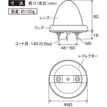 定格電圧(V)DC24付属品フランジナットM5(2個)材質[レフレクター]PP・鉄/[リング]PP/[レンズ]アクリル直径(Φmm)90高さ(mm)96質量(g)約100タイプボルトアース電圧(V)DC24定格電圧DC24V外径×高さH(Φmm×mm)90×96コード長さ(m)140(0.5sq)本体質量(g)約100定格電流(A)約0.5(DC28V時)定格電圧 DC VDC24コード長さ(mm)約140mm (0.5sq)使用電球DC24V/BA15s 12W材質(レンズ)アクリル材質(ベース)PP・鉄質量(g/個)約100取付ピッチ(mm)45~60定格電流(mA)約500(DC28V時)定格電圧変動範囲DC20~32V主材質[レフレクター]PP・鉄/[リング]PP/[レンズ]アクリル材質(リング)PP電球の種類BA15s適合電球DC24V/BA15s 12W内容量1個