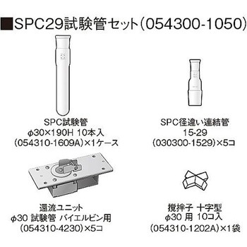 SPC試験管Φ15×170H 10本入り×1ケース、加熱ブッロクアダプターΦ15 CP-1000用×5コ、還流ユニットΦ15×150H SPC15用×5コ、攪拌子+十字型Φ15用 10コ入り×1袋