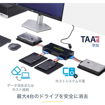 4台のドライブを完全消去:2.5インチ & 3.5インチSATA SSD/HDD対応ハードドライブイレーサー。複数のドライブを別々に同時処理。ホスト接続不要の消去専用機。プラグアンドプレイ対応
